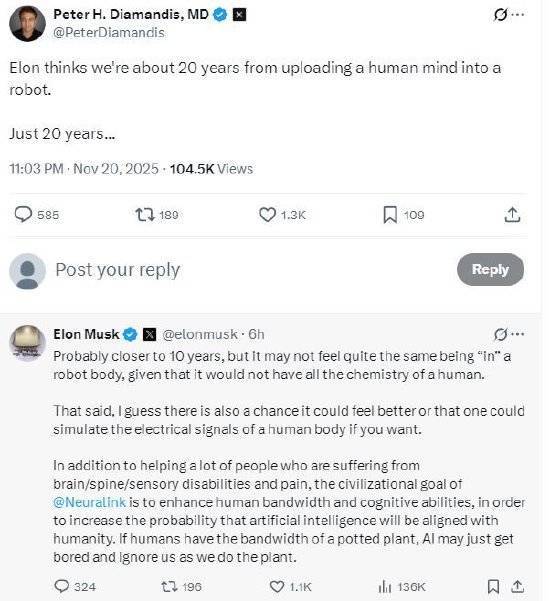 一位X用户周四发帖称:“埃隆认为我们可能再过20年就能将人类的思想上传到机器人。仅仅20年……”